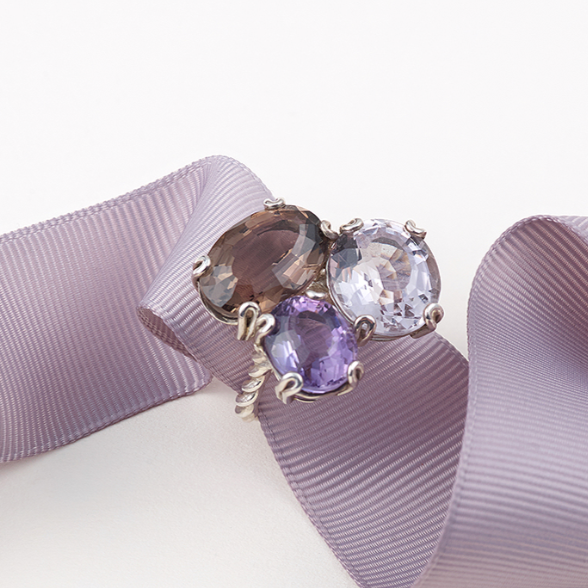Bague en argent avec topaze, prasiolite et quartz fumé.