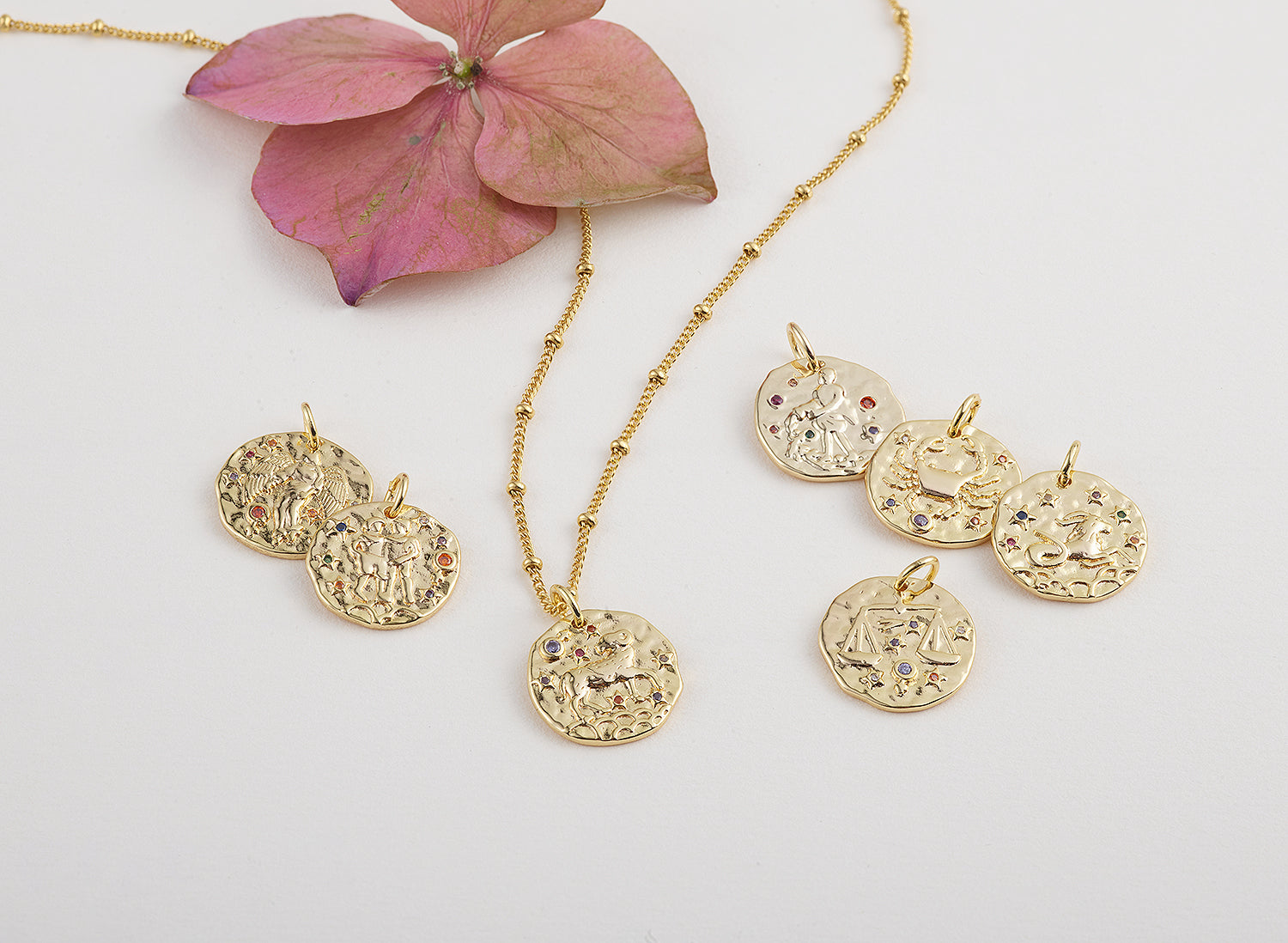 Médailles avec signe astrologique en or 18 carats et saphirs de couleurs.